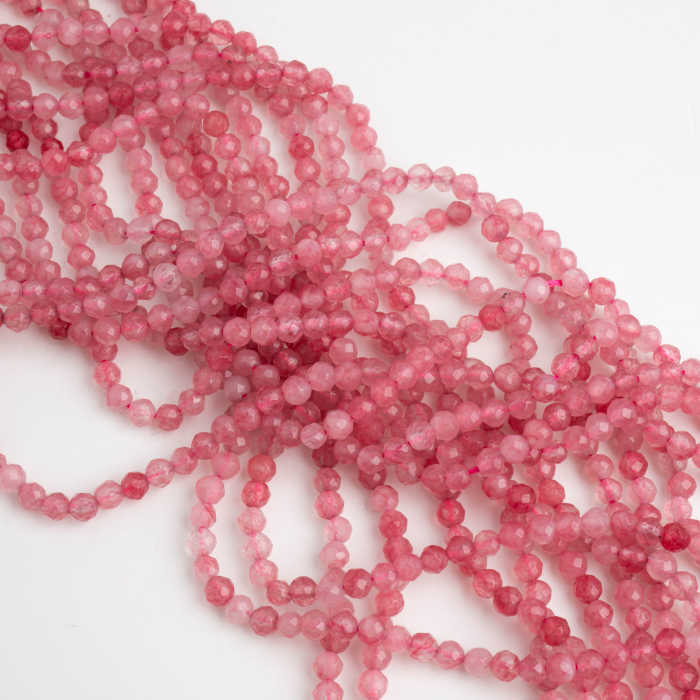Kamienie naturalne wykonane z różowego agatu w kształcie kulki fasetowanej. Dominujący kolor to różowy, wymieszany z mlecznym i fioletem. Niektóre kulki mogą posiadać żółte, pomarańczowe przebarwienia.*Ponieważ są to kamienie naturalne mogą się nieznacznie różnić od siebie rozmiarem.*Rozmiar podany w nazwie produktu jest wartością orientacyjną. Charakterystyka:
