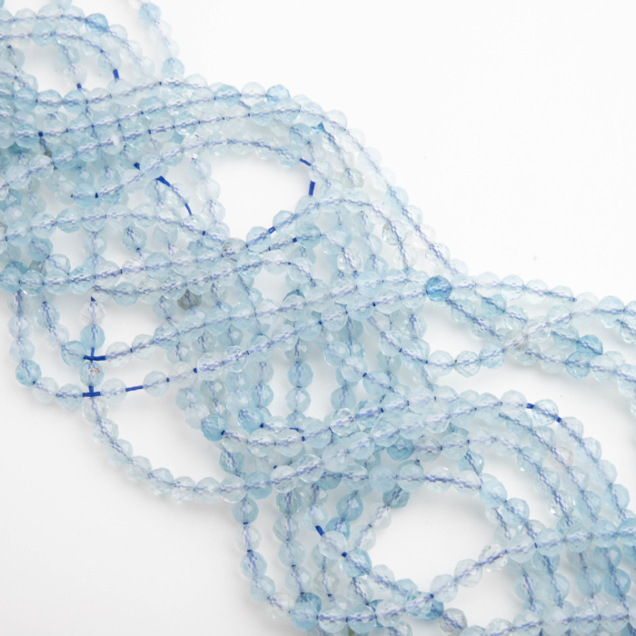 Kamienie naturalne wykonane z akwamarynu w kształcie kulki fasetowanej. Dominujący kolor to jasnoniebieski, niektóre z kamieni są półprzezroczyste lub mleczne. Kamienie posiadają naturalne przebarwienia i wrostki.*Ponieważ są to kamienie naturalne mogą się nieznacznie różnić od siebie rozmiarem.*Rozmiar podany w nazwie produktu jest wartością orientacyjną. Charakterystyka: