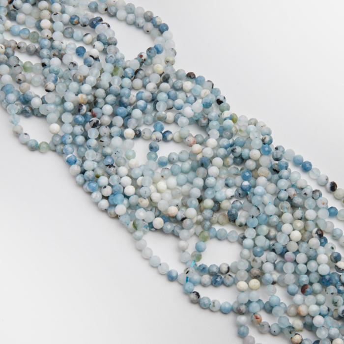 Kamienie naturalne wykonane z akwamarynu w kształcie kulki fasetowanej. Dominujący kolor kamieni to niebieski, przemieszany z mlecznym, białym, różowym, kremowym, szarym, czarnym. Kulki posiadają naturalnie powstałe przebarwienia oraz wrostki.*Ponieważ są to kamienie naturalne mogą się nieznacznie różnić od siebie rozmiarem i kolorem w zależności od partii produkcyjnej.*Rozmiar podany w nazwie produktu jest wartością orientacyjną. Charakterystyka: