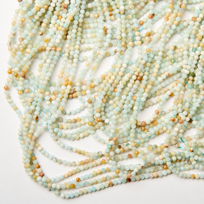 Bardzo drobne kamienie naturalne wykonane z amazonitu w kształcie kulki fasetowanej. Kulki są w różnych kolorach na przykład: niebieski, zielony, biały, beżowy, brązowy. *Ponieważ są to kamienie naturalne mogą się nieznacznie różnić od siebie rozmiarem.*Rozmiar podany w nazwie produktu jest wartością orientacyjną. Charakterystyka: