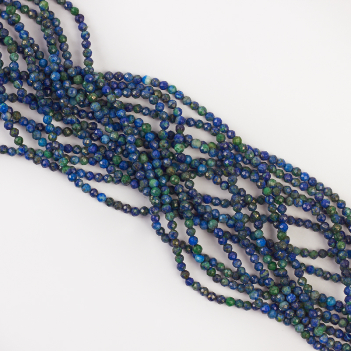 Fasetowane kulki azurytu w odcieniach niebieskiego oraz zielonego. Kamienie z licznymi inkluzjami oraz szklistym połyskiem.*Ponieważ są to kamienie naturalne, mogą nieznacznie różnić się między sobą wielkością. Charakterystyka: