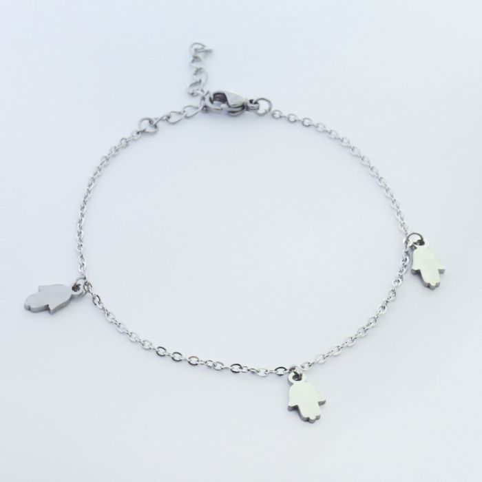 Bransoletka ze stali chirurgicznej z trzema zawieszkami ręka Fatimy w kolorze srebrnym 19,5cm