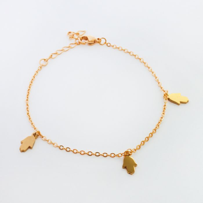 Bransoletka ze stali chirurgicznej z trzema zawieszkami ręka Fatimy w kolorze złotym 19,5cm
