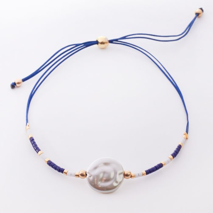 Bransoletka ze sztuczną perłą na sznureczku z koralikami Miyuki granatowa