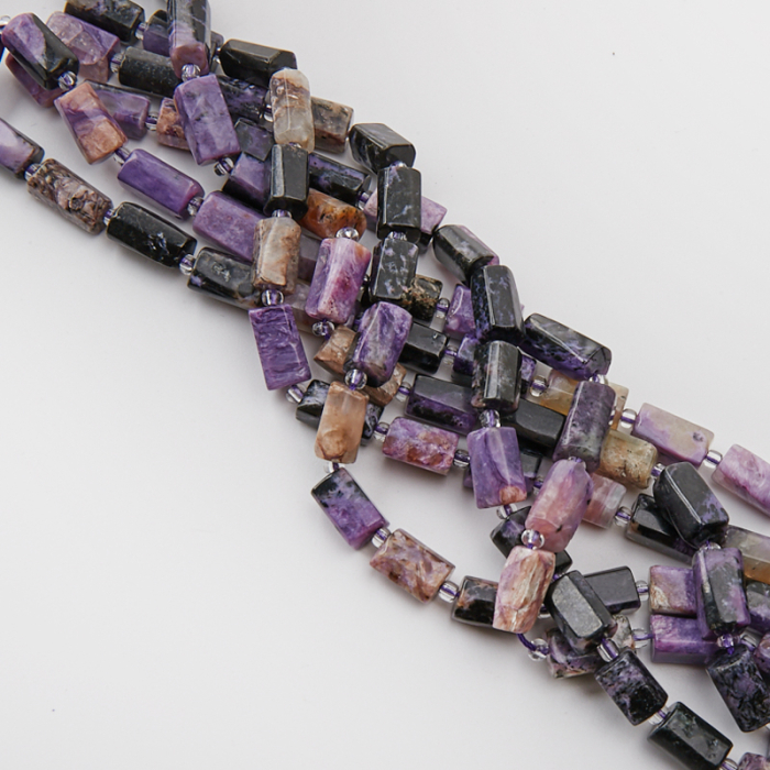 Kamienie naturalne wykonane z czaroitu w kształcie ciosanego słupka. Bazowy kolor to fioletowy, przemieszany z czarnym, beżowym, pomarańczowym, brązowym, szarym. Słupki posiadają naturalnie powstałe przebarwienia oraz wrostki. W większości cięte są pod skosem.*Ponieważ są to kamienie naturalne mogą się nieznacznie różnić od siebie rozmiarem.*Rozmiar podany w nazwie produktu jest wartością orientacyjną. Charakterystyka: