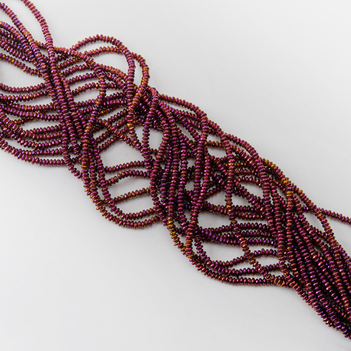 Kamienie naturalne wykonane z hematytu w kształcie oponki fasetowanej. Dominujący kolor to fioletowy - volcano z przebarwieniami w kolorze żółtopomarańczowym. W przekroju kamienie mogą być szare, grafitowe.*Ponieważ są to kamienie naturalne mogą się nieznacznie różnić od siebie rozmiarem.*Rozmiar podany w nazwie produktu jest wartością orientacyjną. Charakterystyka: