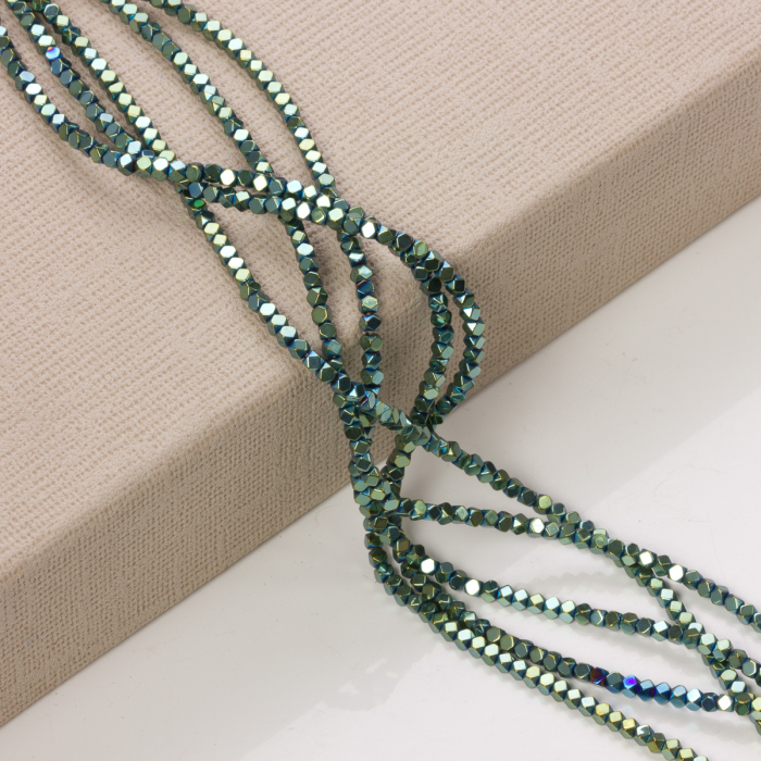 Ścięte kosteczki z hematytu w emeraldowym kolorze. Kosteczki mienią się w odcieniach zieleni i złota. Charakterystyka: