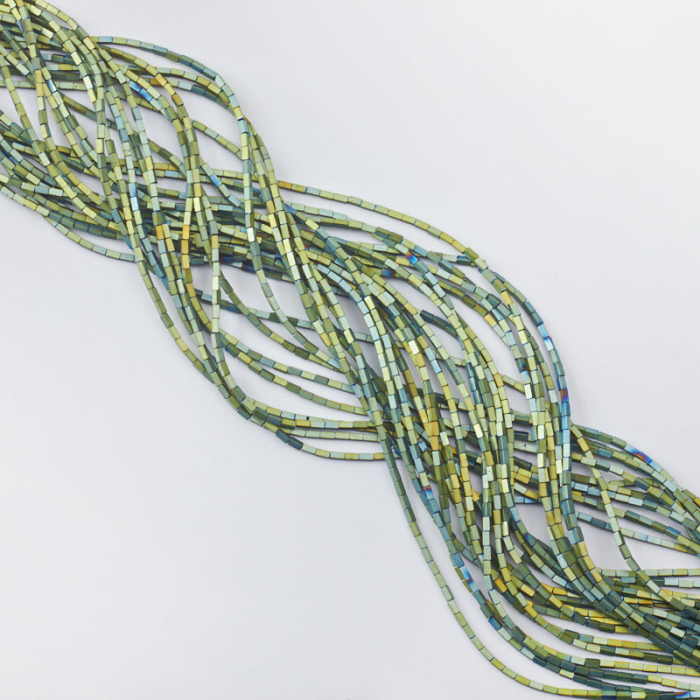 Małe ścięte słupki w różnych odcieniach zieleni, wpadające w złoty kolor. Niektóre słupki mogą być w odcieniach granatu.*Uwaga!Produkt przeznaczony do wykonywania rękodzieła w tym biżuterii i innych ozdób. Charakterystyka: