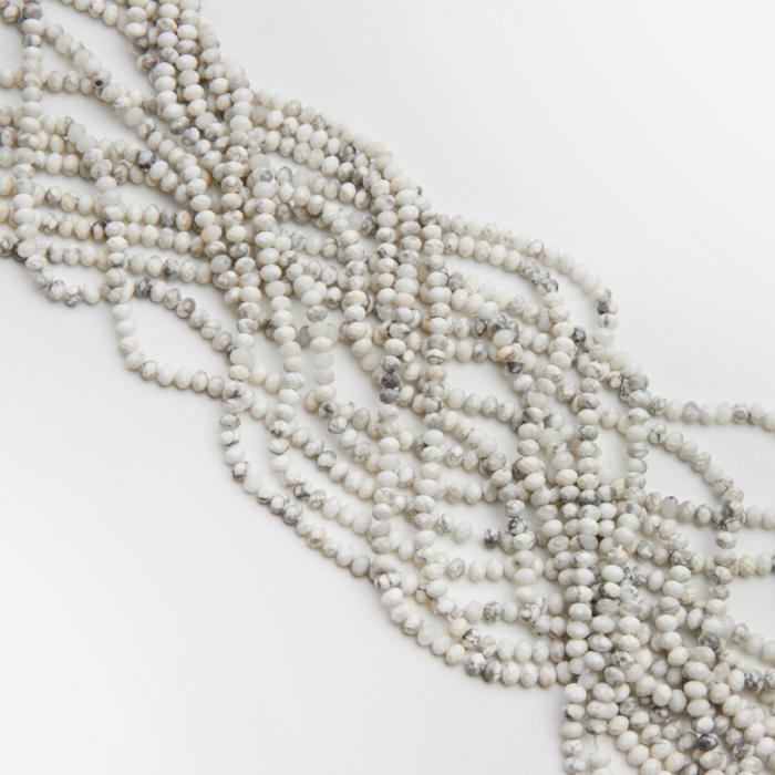 Kamienie naturalne wykonane z howlitu w kształcie oponki fasetowanej. Bazowy kolor to biały z licznymi szaroczarnymi wrostkami, nitkami. Kamienie posiadają naturalnie powstałe wrostki i przebarwienia.*Ponieważ są to kamienie naturalne mogą się nieznacznie różnić od siebie rozmiarem i kolorem w zależności od partii produkcyjnej.*Rozmiar podany w nazwie produktu jest wartością orientacyjną. Charakterystyka: