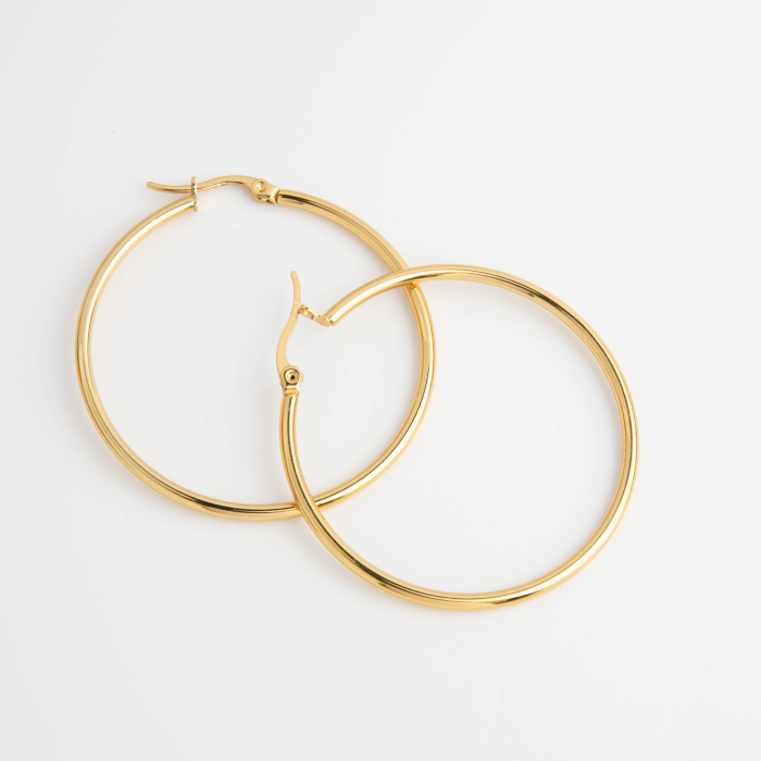 Kolczyki koła ze stali chirurgicznej w kolorze złotym 45mmTo estetyczny element biżuteryjny ze stali chirurgicznej 316L, chętnie wybierany do nowoczesnych projektów. To materiał chętnie wybierany do biżuterii handmade ze względu na trwałość, estetykę i wygodę użytkowania.Element do kolczyków wykonany ze stali chirurgicznej 316L to praktyczna baza do tworzenia wygodnej i trwałej biżuterii. Dzięki prostej formie można go wykorzystać zarówno w minimalistycznych projektach, jak i w bardziej ozdobnych kompozycjach z kamieniami, perłami lub zawieszkami.Rozmiar