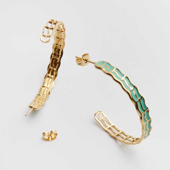 Kolczyki ze stali chirurgicznej koło ozdobne z turkusową emalią w kolorze złotym 40mm PVD