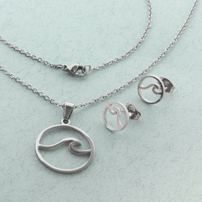 Komplet biżuterii ze stali chirurgicznej z kolczykami fala w kółku w kolorze srebrnym 50cm