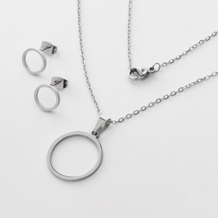 Komplet biżuterii ze stali chirurgicznej z kolczykami koło wycięte w kolorze srebrnym 45cm