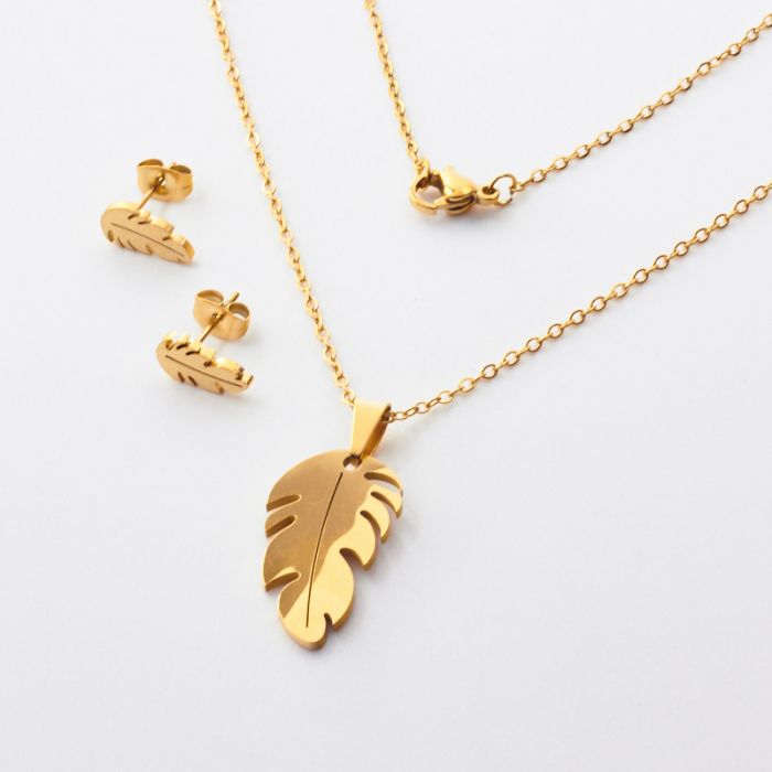 Komplet biżuterii ze stali chirurgicznej z kolczykami piórko w kolorze złotym 45cm