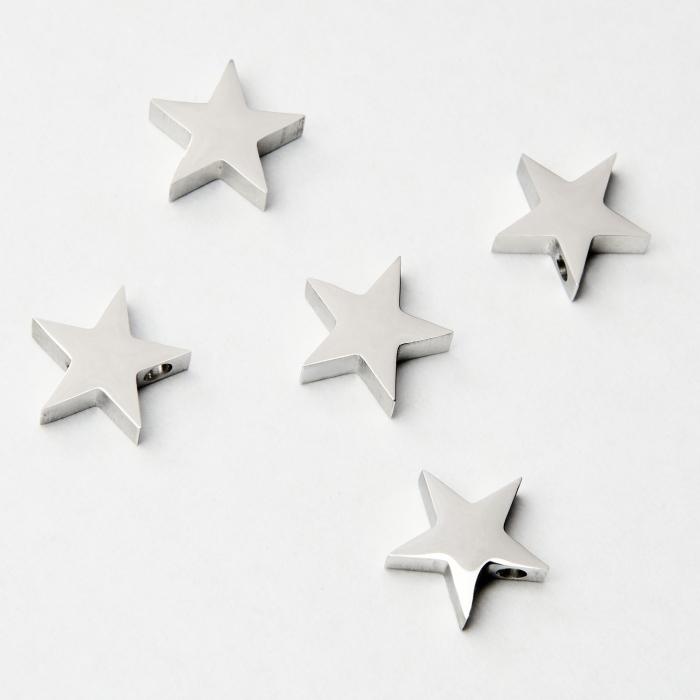 Koralik gwiazdka ze stali szlachetnej w kolorze srebrnym 10mmKoralik gwiazdka to starannie wykonany element do tworzenia biżuterii handmade.Stal szlachetna 304 jest ceniona za odporność na korozję i estetyczny wygląd w codziennym użytkowaniu.To materiał chętnie wybierany do projektów handmade ze względu na trwałość i dopracowane wykończenie.Koralik z motywem gwiazdki może pełnić funkcję ozdobnego akcentu lub głównego elementu kompozycji w bransoletkach i naszyjnikach.Rozmiar 10 mm dobrze sprawdzi się w delikatniejszych i klasycznych projektach, a kolor srebrny ułatwia dopasowanie elementu do pozostałych komponentów.Rozmiar otworu 1.5 - 1.9 mm pomaga wygodnie połączyć koralik z łańcuszkiem, sznurkiem lub innymi elementami projektu.Dlaczego warto?• Stal szlachetna 304- trwała, odporna na korozję i odpowiednia do codziennego użytkowania.• Kolor srebrny- łatwy do dopasowania do innych metalowych elementów biżuterii.• Rozmiar 10 mm- odpowiedni do planowanego projektu.• Starannie wykonany detal- estetyczne wykończenie w projektach handmade.• Pomaga porządkować kompozycję- dobrze sprawdza się jako akcent, przekładka lub element ozdobny.Zastosowanie:• bransoletki z kamieni naturalnych• naszyjniki z detalem ozdobnym• kolczyki z elementami stalowymi• projekty wymagające oddzielenia i zaakcentowania elementówFAQ – najczęstsze pytania1. Czy stal szlachetna 304 rdzewieje lub ciemnieje?- Stal szlachetna 304 jest odporna na korozję i dobrze znosi codzienne użytkowanie. Aby jak najdłużej zachowała estetyczny wygląd, warto unikać długiego kontaktu z agresywną chemią.2. Czy stal szlachetna 304 nadaje się do codziennego użytkowania?- Tak, stal 304 jest chętnie wybierana do biżuterii noszonej na co dzień, ponieważ łączy trwałość z estetycznym wyglądem.3. Czy elementy ze stali szlachetnej można łączyć z innymi półfabrykatami?- Tak, stal szlachetna 304 dobrze komponuje się z kamieniami, perłami, sznurkami, łańcuszkami i innymi elementami wykorzystywanymi w biżuterii handmade.4. Czy kolor złoty w stali szlachetnej zawsze jest wykonywany tą samą metodą?- Nie. W zależności od produktu kolor złoty może być uzyskany różnymi metodami, dlatego informację o wykończeniu warto sprawdzać w danych konkretnego produktu.5. Do jakich projektów nadają się elementy ze stali szlachetnej?- Stal szlachetna 304 sprawdza się w naszyjnikach, bransoletkach, kolczykach, zawieszkach oraz wielu innych projektach biżuterii handmade.Koralik gwiazdka w kolorze srebrnym to praktyczny i estetyczny element, który pomoże Ci stworzyć dopracowaną biżuterię handmade. Dodaj go do koszyka i wykorzystaj w swoim kolejnym projekcie.*Uwaga!Produkt przeznaczony do wykonywania rękodzieła, w tym biżuterii i innych ozdób. Produkt nie jest przeznaczony dla dzieci i zwierząt. Produkt nie jest przeznaczony do spożycia. Podczas używania produktu zalecamy stosowanie sprzętu ochronnego np. okularów ochronnych, rękawic. Produkt należy przechowywać poza zasięgiem dzieci oraz zwierząt domowych, a także stosować zgodnie z jego przeznaczeniem. Małe elementy stanowią zagrożenie uduszenia w przypadku połknięcia.Czytaj więcej o bezpieczeństwie.To element wykonany ze stali szlachetnej 304L, cenionej za trwałość i odporność na korozję.