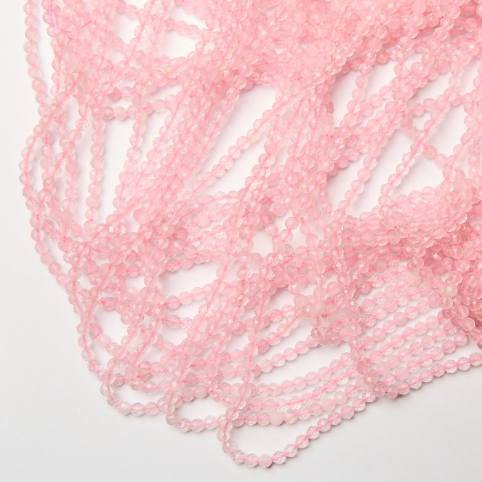 Kamienie wykonane z kwarcu różowego w kształcie kulki fasetowanej. Kamienie są mleczne, półprzezroczyste z bardzo jasnym, różowym wybarwieniem. Kamienie w większości mogą być w kolorze mlecznym. Kolor widoczny na zdjęciu jest bardziej intensywny przez kolor sznura.*Uwaga!Produkt przeznaczony do wykonywania rękodzieła w tym biżuterii i innych ozdób. Charakterystyka: