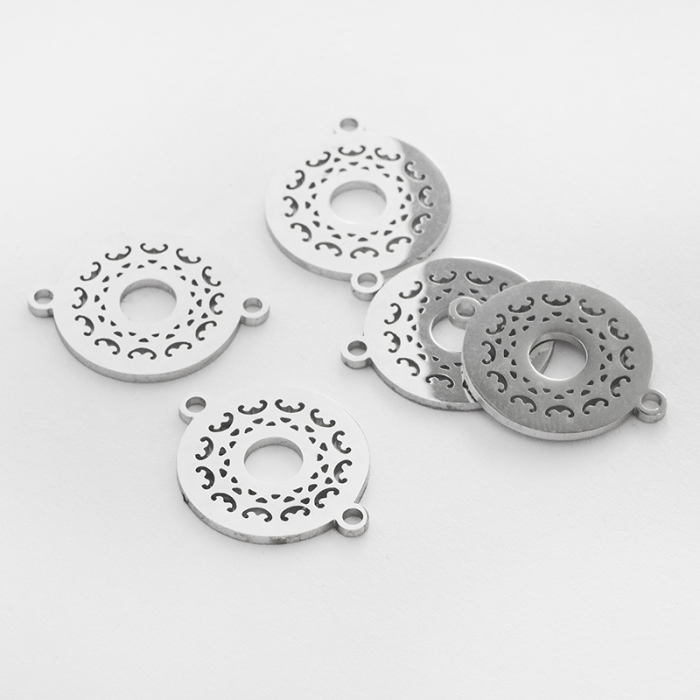 Łącznik ze stali chirurgicznej kółko ażurowe w kolorze srebrnym 19mmTo praktyczny półfabrykat do projektów biżuteryjnych. Stal szlachetna dobrze sprawdza się w biżuterii noszonej na co dzień, ponieważ łączy trwałość z estetycznym wykończeniem.Łącznik ze stali szlachetnej to praktyczny i dekoracyjny element, który pozwala w estetyczny sposób połączyć różne części biżuterii. Sprawdza się w bransoletkach, naszyjnikach i kolczykach, gdzie liczy się zarówno funkcjonalność, jak i spójny wygląd projektu.Forma lub motyw
