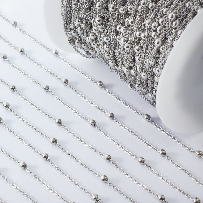 Łańcuch ze stali szlachetnej z kuleczkami w kolorze srebrnym 1,5x2mmTo uniwersalny element wykończeniowy i dekoracyjny do projektów jubilerskich. To materiał chętnie wybierany do biżuterii handmade ze względu na trwałość, estetykę i wygodę użytkowania.W tym produkcie zastosowano stal szlachetną