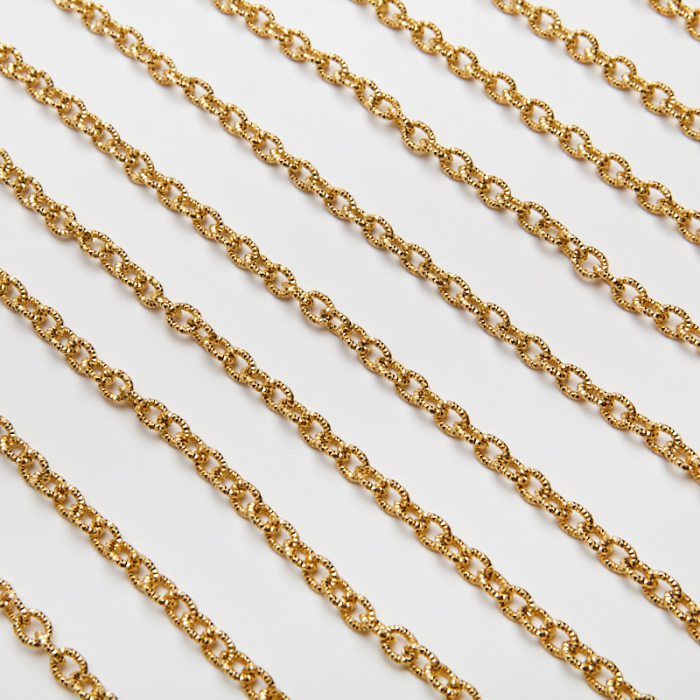 Łańcuszek owale nacinane diamentowane ze stali chirugicznej w kolorze złotym 8x6mmTo trwały i estetyczny element do tworzenia biżuterii handmade. Stal szlachetna dobrze sprawdza się w biżuterii noszonej na co dzień, ponieważ łączy trwałość z estetycznym wykończeniem.W tym produkcie zastosowano stal szlachetną