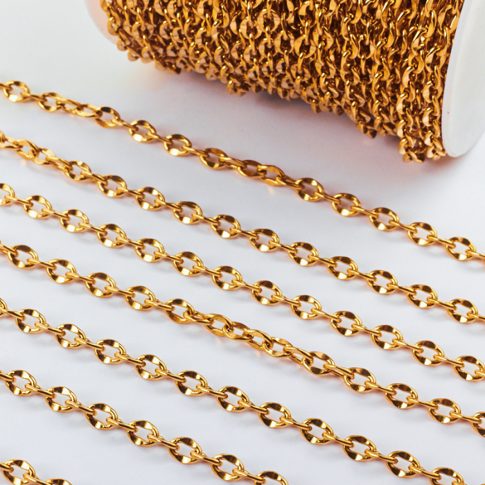 Łańcuszek ze stali szlachetnej owale gniecione w kolorze złotym 7x5mmTo uniwersalny element wykończeniowy i dekoracyjny do projektów jubilerskich. Stal szlachetna to materiał ceniony za trwałość i estetyczny wygląd w codziennym użytkowaniu.W tym produkcie zastosowano stal szlachetną