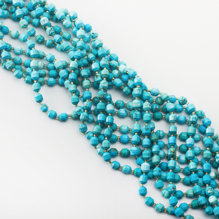 Kamienie naturalne wykonane z magnezytu w kształcie baryłki fasetowanej. Dominujący kolor to niebieski, morski. Kamienie posiadają naturalne wrostki, nitki w kolorze brązowozłotym. Niektóre z kamieni mają wybarwienia w kolorze białym.*Ponieważ są to kamienie naturalne mogą się nieznacznie różnić od siebie rozmiarem.*Rozmiar podany w nazwie produktu jest wartością orientacyjną. Charakterystyka: