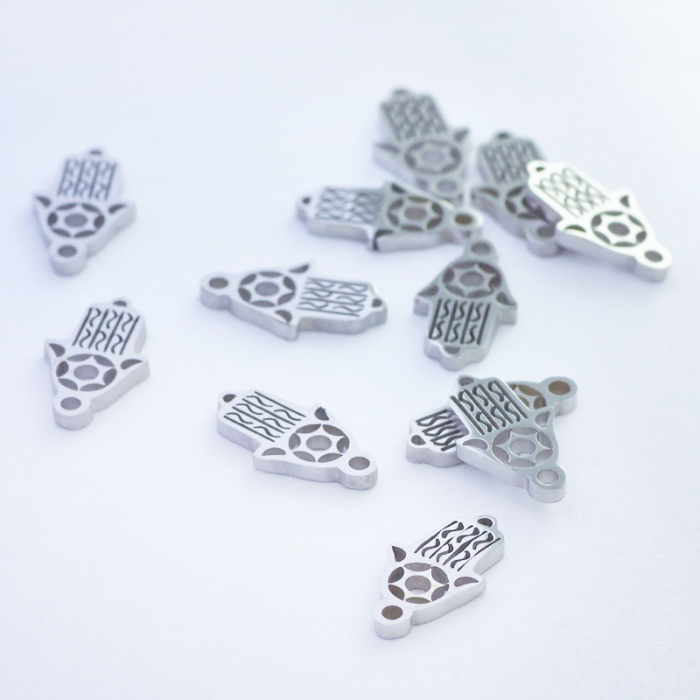 Mini łącznik ze stali szlachetnej ręka Fatimy w kolorze srebrnym 10,5mmTo starannie wykonany element, który łączy funkcjonalność z estetycznym wyglądem. Stal szlachetna dobrze sprawdza się w biżuterii noszonej na co dzień, ponieważ łączy trwałość z estetycznym wykończeniem.W tym produkcie zastosowano stal szlachetną