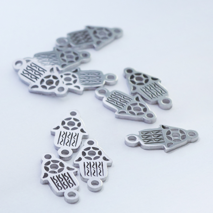 Mini łącznik ze stali szlachetnej ręka Fatimy w kolorze srebrnym 10mmTo trwały i estetyczny element do tworzenia biżuterii handmade. Stal szlachetna to materiał ceniony za trwałość i estetyczny wygląd w codziennym użytkowaniu.W tym produkcie zastosowano stal szlachetną