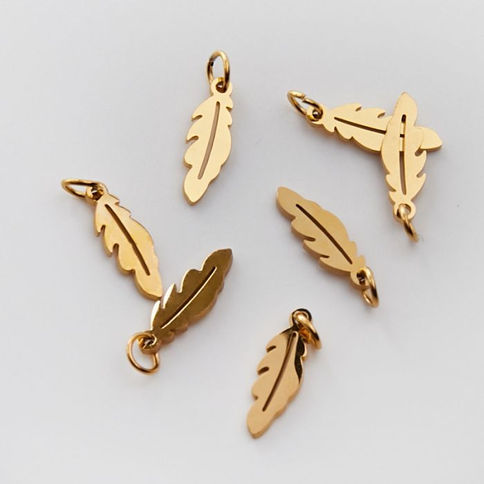 Mini zawieszka ze stali chirurgicznej piórko w kolorze złotym 14,5mm PVD