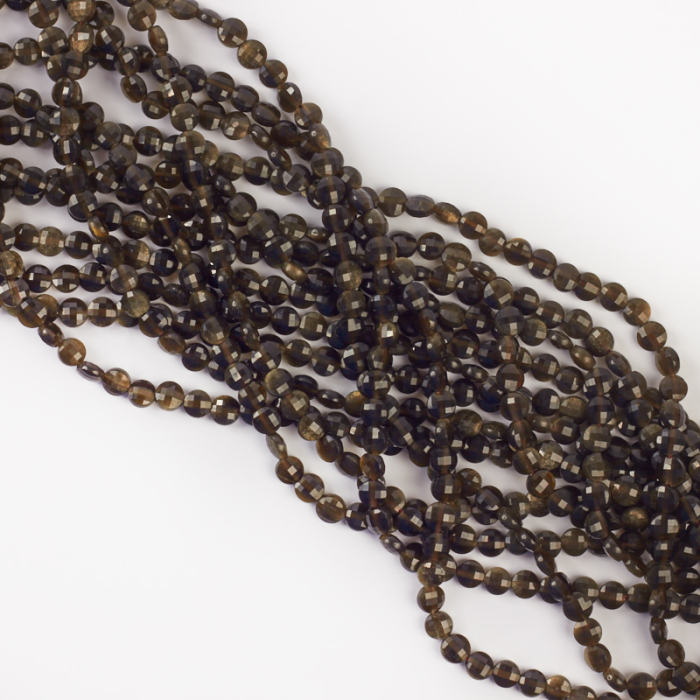 Fasetowane dyski obsydianu cechujące się iryzacją w kolorze złocistym.Ponieważ są to kamienie naturalne, mogą się one różnić nieznacznie rozmiarem. Charakterystyka: