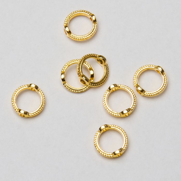 Dekoracyjna ramka, która podkreśla koralik efektem obwódki (halo) i porządkuje kompozycję. Wersja w kolorze złotym, ze stopu metalu. Średnica wewnętrzna 6 mm eksponuje koralik i pomaga utrzymać równą oś w projekcie.