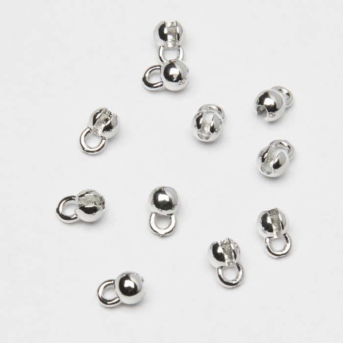 Eleganckie końcówki w formie gładkiej „kulki” z oczkiem do podpięcia zapięcia lub łańcuszka regulacyjnego. Wykonane ze stali chirurgicznej, w kolorze srebrnym, z wewnętrznym otworem 1,2 mm do estetycznego zakończenia nici, sznurków, gumek i linek stalowych.