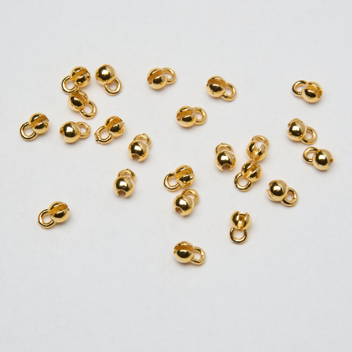 Stylowe końcówki w formie gładkiej „kulki” z oczkiem do podpięcia zapięcia lub łańcuszka. Wykonane ze stali chirurgicznej, w kolorze złotym, z otworem 1,2 mm odpowiednim dla nici, sznurków, gumek i linek stalowych.