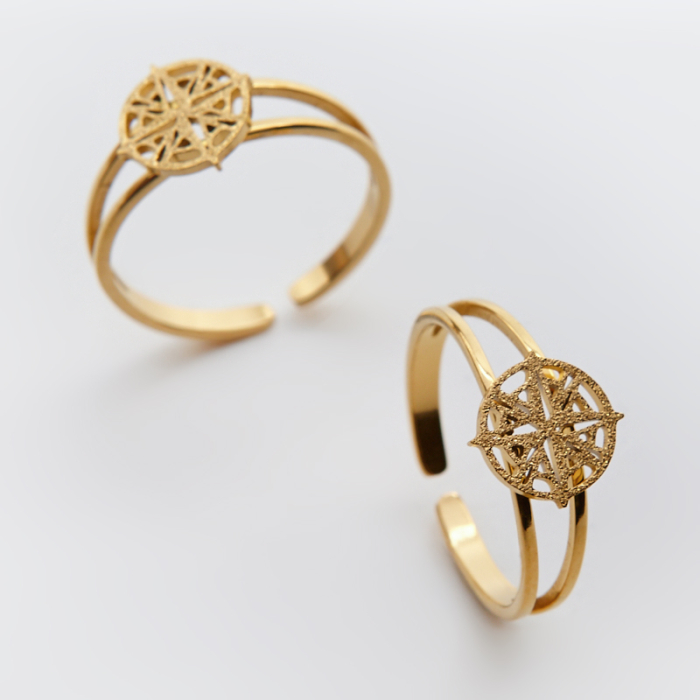 Pierścionek regulowany ze stali chirurgicznej z różą wiatrów w kolorze złotym 20mm