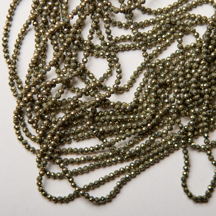 Bardzo drobne kuleczki wykonane z kamienia naturalnego - piryt. Dominującym kolorem jest złoty, jednak kulki dają efekt przybrudzonego złota. Mają metaliczny połysk.Na powierzchni kamieni mogą znajdować się niewielkie żłobienia przypominające kropeczki.*Ponieważ są to kamienie naturalne mogą się nieznacznie różnić od siebie rozmiarem.*Rozmiar podany w nazwie produktu jest wartością orientacyjną. Charakterystyka: