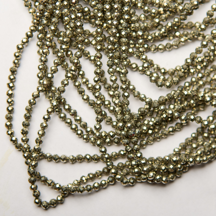 Drobne fasetowane kulki, wykonane z pirytu. Dominującym kolorem jest złoty, pomieszany z kolorem czarnym. Daje efekt przydymionego złotego.*Ponieważ są to kamienie naturalne mogą się nieznacznie różnić od siebie rozmiarem.*Rozmiar podany w nazwie produktu jest wartością orientacyjną. Charakterystyka: