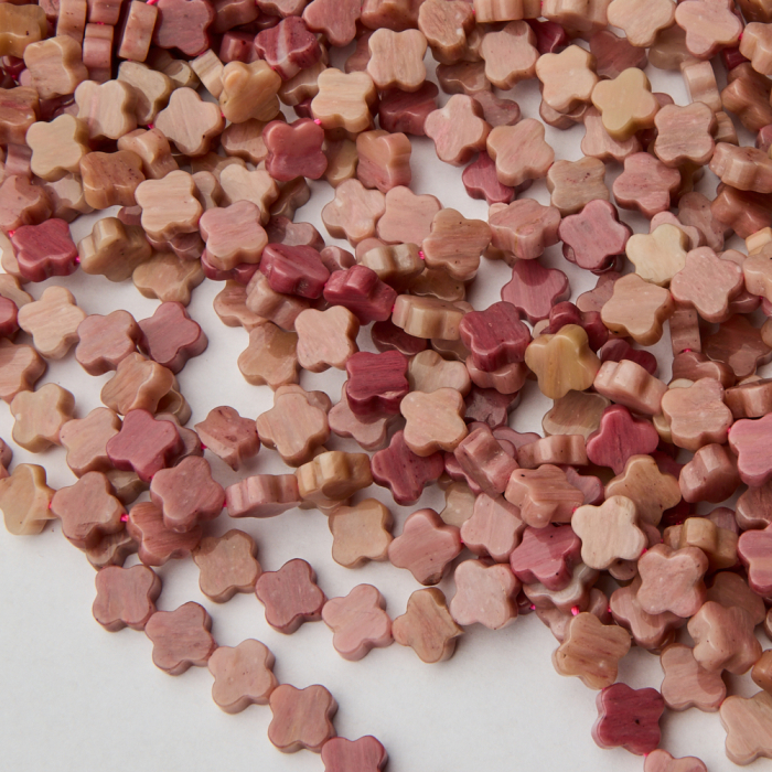 "Kamienie naturalne wykonane z rodochrozytu w kształcie koniczyny marokańskiej. Dominujący kolor to różowy, przemieszany z beżowym. Kamienie posiadają naturalnie powstałe wrostki oraz przebarwienia.*Ponieważ są to kamienie naturalne, mogą się nieznacznie różnić od siebie rozmiarem i kolorem w zależności od partii produkcyjnej.*Rozmiar podany w nazwie produktu jest wartością orientacyjną. Charakterystyka: