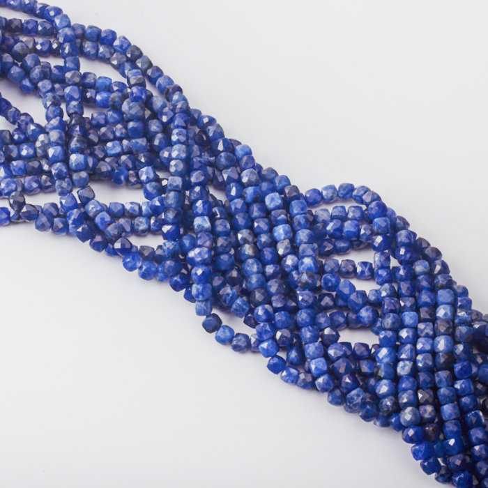 "Kamienie naturalne wykonane z sodalitu granatowego w kształcie kostki fasetowanej. Dominujący kolor to granatowy, jednak niektóre kamienie posiadają przebarwienia mleczne, białe i czarne. Kamienie posiadają naturalne powstałe wrostki. *Ponieważ są to kamienie naturalne mogą się nieznacznie różnić od siebie rozmiarem.*Rozmiar podany w nazwie produktu jest wartością orientacyjną. Charakterystyka: