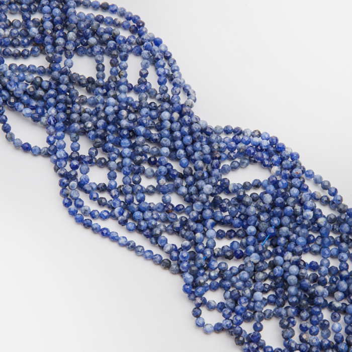 Kamienie naturalne wykonane z sodalitu w kształcie kulki fasetowanej. Bazowym kolorem kamieni jest niebieski, przemieszany z szarym, czarnym, białym, mlecznym. Kamienie posiadają naturalnie powstałe wrostki oraz przebarwienia.*Ponieważ są to kamienie naturalne mogą się nieznacznie różnić od siebie rozmiarem i kolorem w zależności od partii produkcyjnej.*Rozmiar podany w nazwie produktu jest wartością orientacyjną. Charakterystyka:
