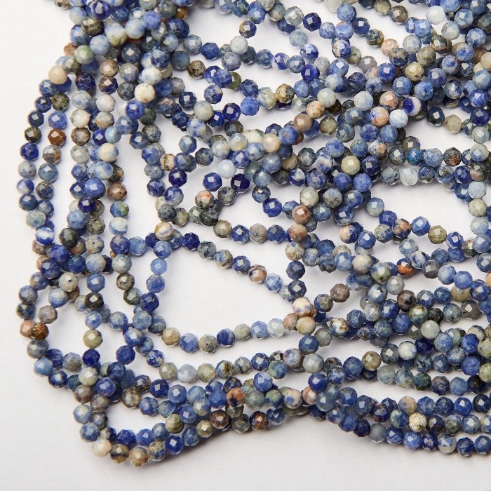 Kamienie naturalne wykonane z sodalitu w kształcie kulki fasetowanej. Bazowym kolorem kamieni jest niebieski, przemieszany z szarym, czarnym, białym, mlecznym. Kamienie posiadają naturalnie powstałe wrostki oraz przebarwienia.*Ponieważ są to kamienie naturalne mogą się nieznacznie różnić od siebie rozmiarem i kolorem w zależności od partii produkcyjnej.*Rozmiar podany w nazwie produktu jest wartością orientacyjną. Charakterystyka: