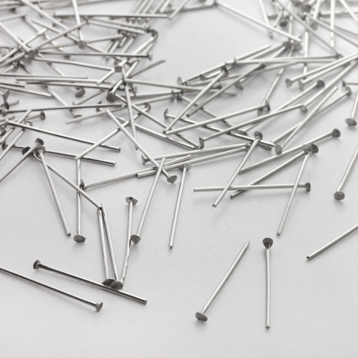 Szpilki ze stali szlachetnej z płaską główką w kolorze srebrnym 20x0,7mmTo trwały i estetyczny element do tworzenia biżuterii handmade. Stal szlachetna dobrze sprawdza się w biżuterii noszonej na co dzień, ponieważ łączy trwałość z estetycznym wykończeniem.W tym produkcie zastosowano stal szlachetną