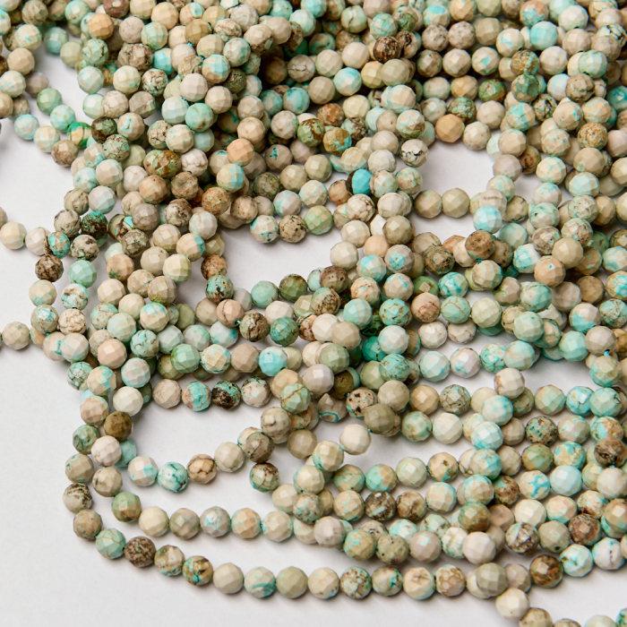 Kamień naturalny – turkus afrykański, w kształcie kulki fasetowanej. Bazowym kolorem jest turkusowy, przeplatany z białym, zielonym, niebieskim, kremowym, szarym. Kamienie posiadają naturalnie powstałe wrostki i przebarwienia.*Ponieważ są to kamienie naturalne mogą się nieznacznie różnić od siebie rozmiarem i kolorem w zależności od partii produkcyjnej.*Rozmiar podany w nazwie produktu jest wartością orientacyjną. Charakterystyka: