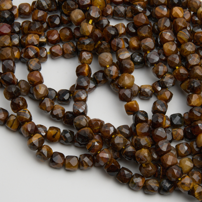Kamienie naturalne wykonane z tygrysiego oka w kształcie kostki fasetowanej. Dominującym kolorem jest brązowy, bursztynowy. Kamienie pięknie się mienią oraz posiadają naturalne słoje, oraz wrostki, nitki.*Ponieważ są to kamienie naturalne mogą się nieznacznie różnić od siebie rozmiarem i kolorem w zależności od partii produkcyjnej.*Rozmiar podany w nazwie produktu jest wartością orientacyjną. Charakterystyka: