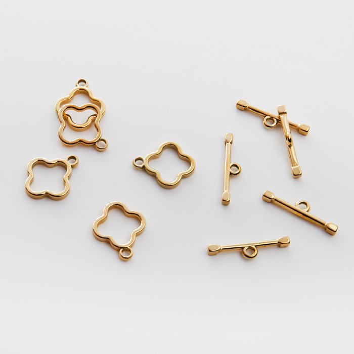 Zapięcie toggle ze stali chirurgicznej koniczyna marokańska w kolorze złotym 16mm PVDTo starannie wykonany element do tworzenia biżuterii handmade. W biżuterii handmade stal chirurgiczna jest ceniona za dobry wygląd, odporność na korozję i wygodę codziennego użytkowania. Wykończenie w kolorze złotym uzyskane metodą PVD.Zapięcie ze stali chirurgicznej w kolorze