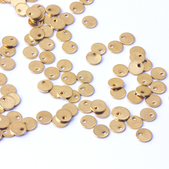 Forma lub motyw blaszka okrągła gładka, pozłacana oraz rozmiar 6mm sprawiają, że element pasuje do delikatnych bransoletek, kolczyków i subtelnych naszyjników, a kolor złoty dobrze komponuje się z innymi stalowymi dodatkami.