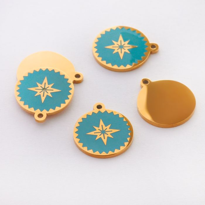 Zawieszka emaliowana kółko ze stali chirurgicznej w kolorze złotym róża wiatrów turkusowa 13mm