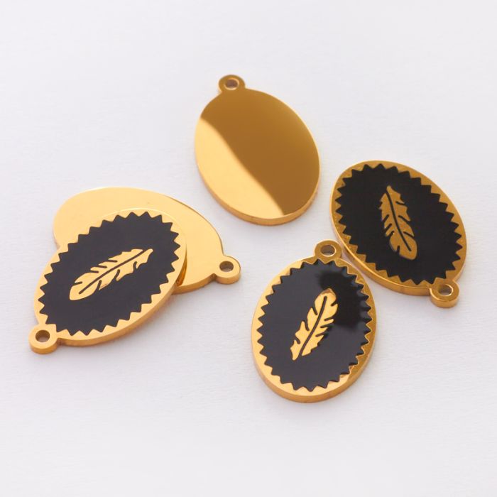 Zawieszka emaliowana owal ze stali chirurgicznej w kolorze złotym piórko czarne 17,7mm
