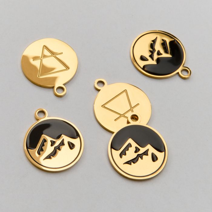 Zawieszka ze stali chirurgicznej góry na emaliowanym czarnym tle w kolorze złotym 18mm PVD