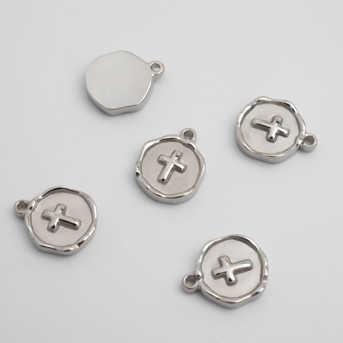 Zawieszka ze stali chirurgicznej heksagon z krzyżem w kolorze srebrnym 13mm