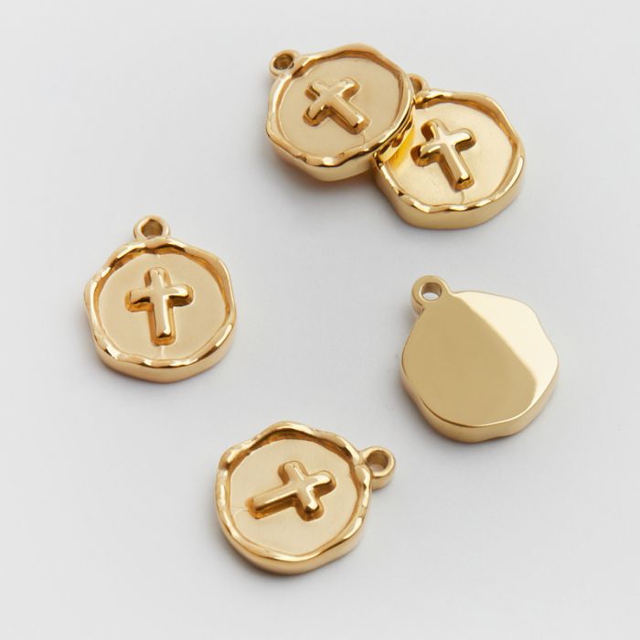 Zawieszka ze stali chirurgicznej heksagon z krzyżem w kolorze złotym 13mm PVD