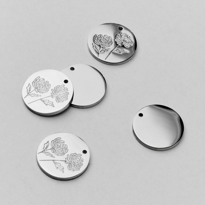 Zawieszka ze stali chirurgicznej kółko z grawerem dwóch kwiatów chryzantemy w kolorze srebrnym 13mm